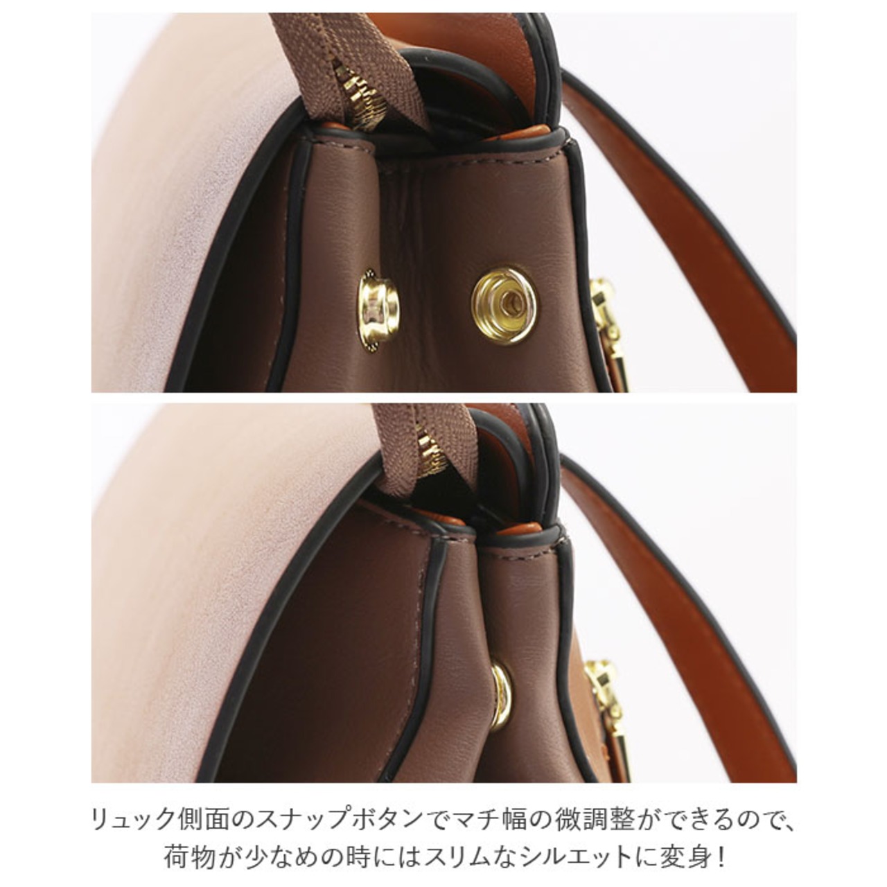 ・リュック側面のスナップボタンでマチ幅の微調整ができるので、荷物が少なめの時にはスリムなシルエットに変身!