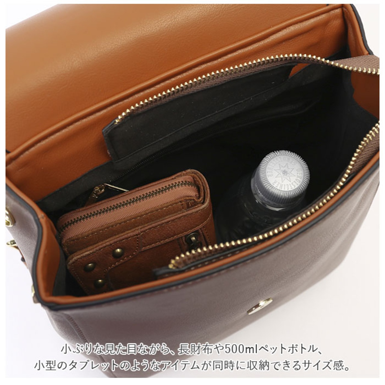 ・メイン収納ルームはB5サイズに対応。小ぶりな見た目ながら、長財布や500mlペットボトル、小型のタブレットのようなアイテムが同時に収納できるサイズ感。