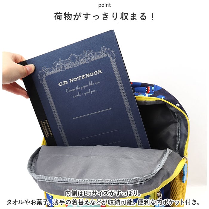 ・内側はB5サイズがすっぽり。タオルやお菓子、薄手の着替えなどが収納可能。便利な内ポケット付き。
