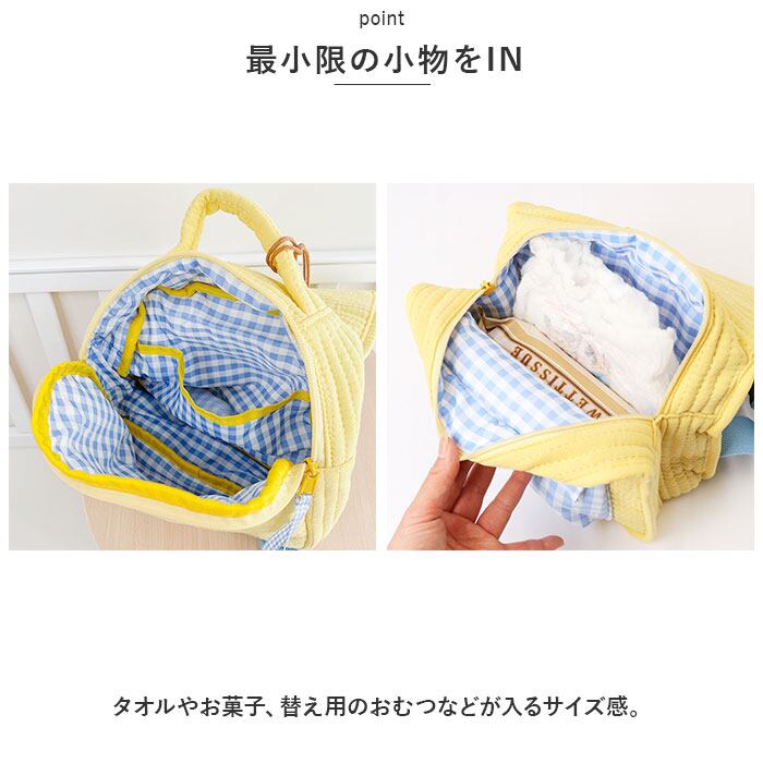 ・タオルやお菓子、替え用のおむつなどが入るサイズ感。