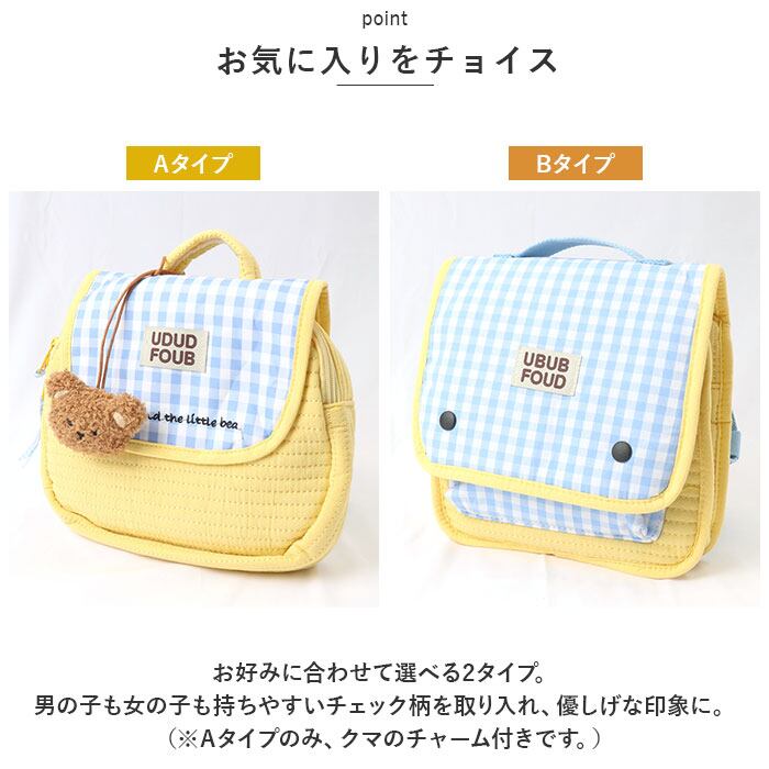 ・お好みに合わせて選べる2タイプ。男の子も女の子も持ちやすいチェック柄を取り入れ、優しげな印象に。(※Aタイプのみ、クマのチャーム付きです。)