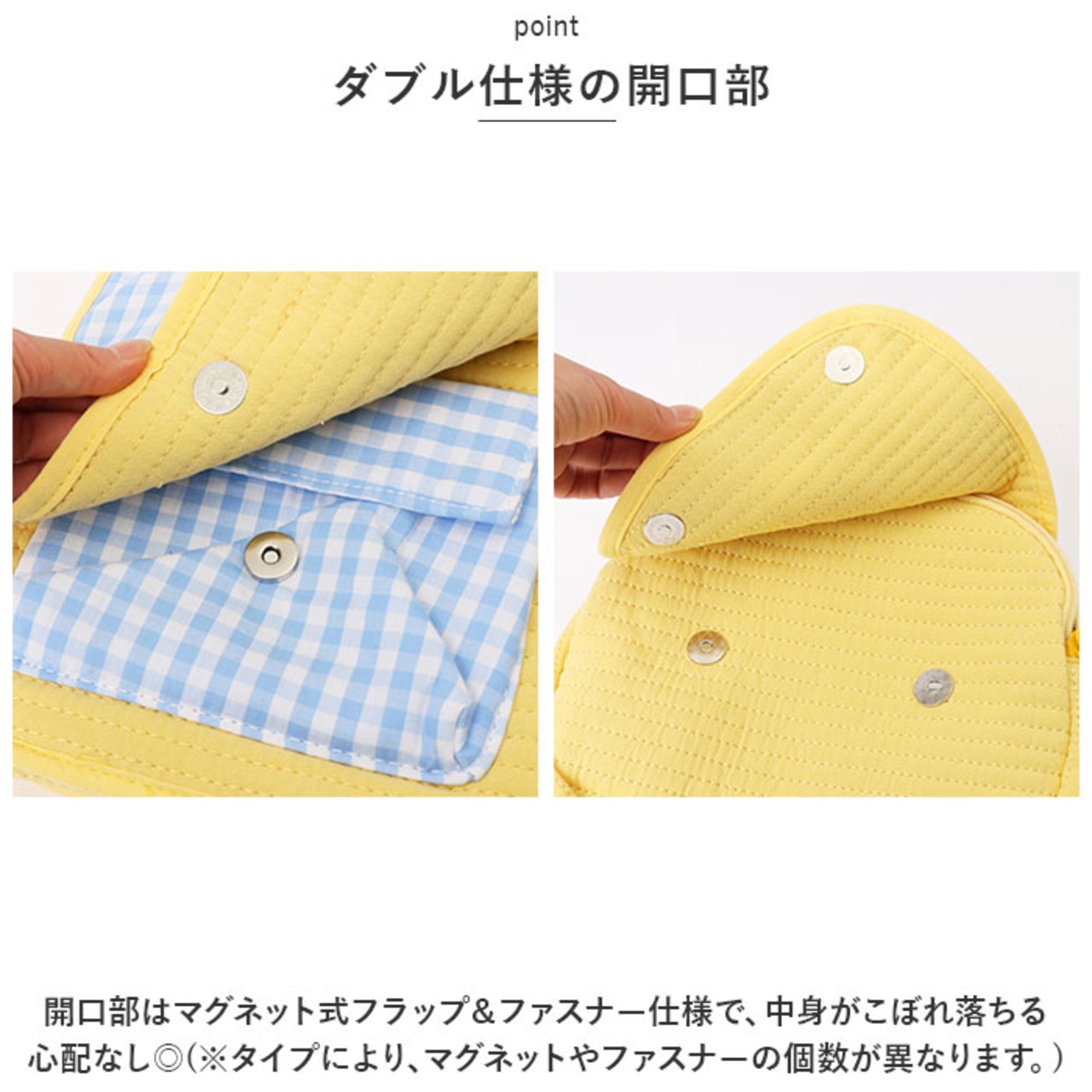 ・開口部はマグネット式フラップ&ファスナー仕様で、中身がこぼれ落ちる心配なし◎(※タイプにより、マグネットやファスナーの個数が異なります。)