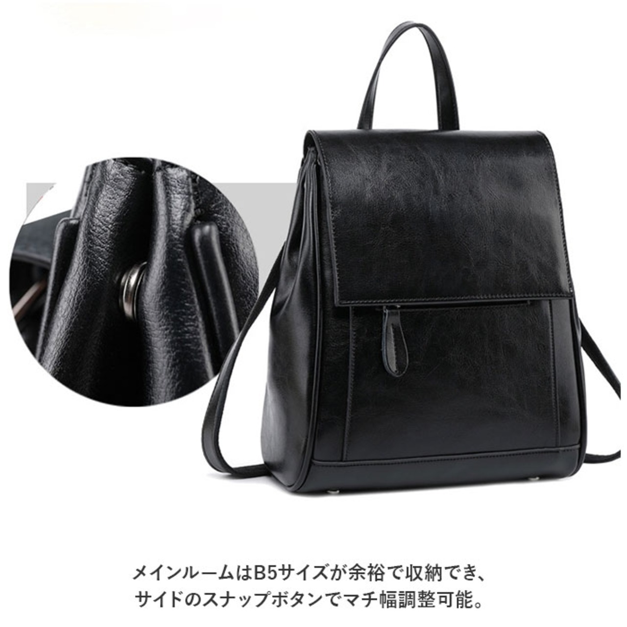 ・メインルームはB5サイズが余裕で収納でき、サイドのスナップボタンでマチ幅調整可能。多ポケットで小物の整理もしやすく、マチがしっかりあるので見た目以上の収納力。