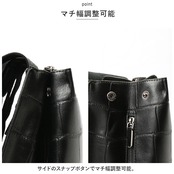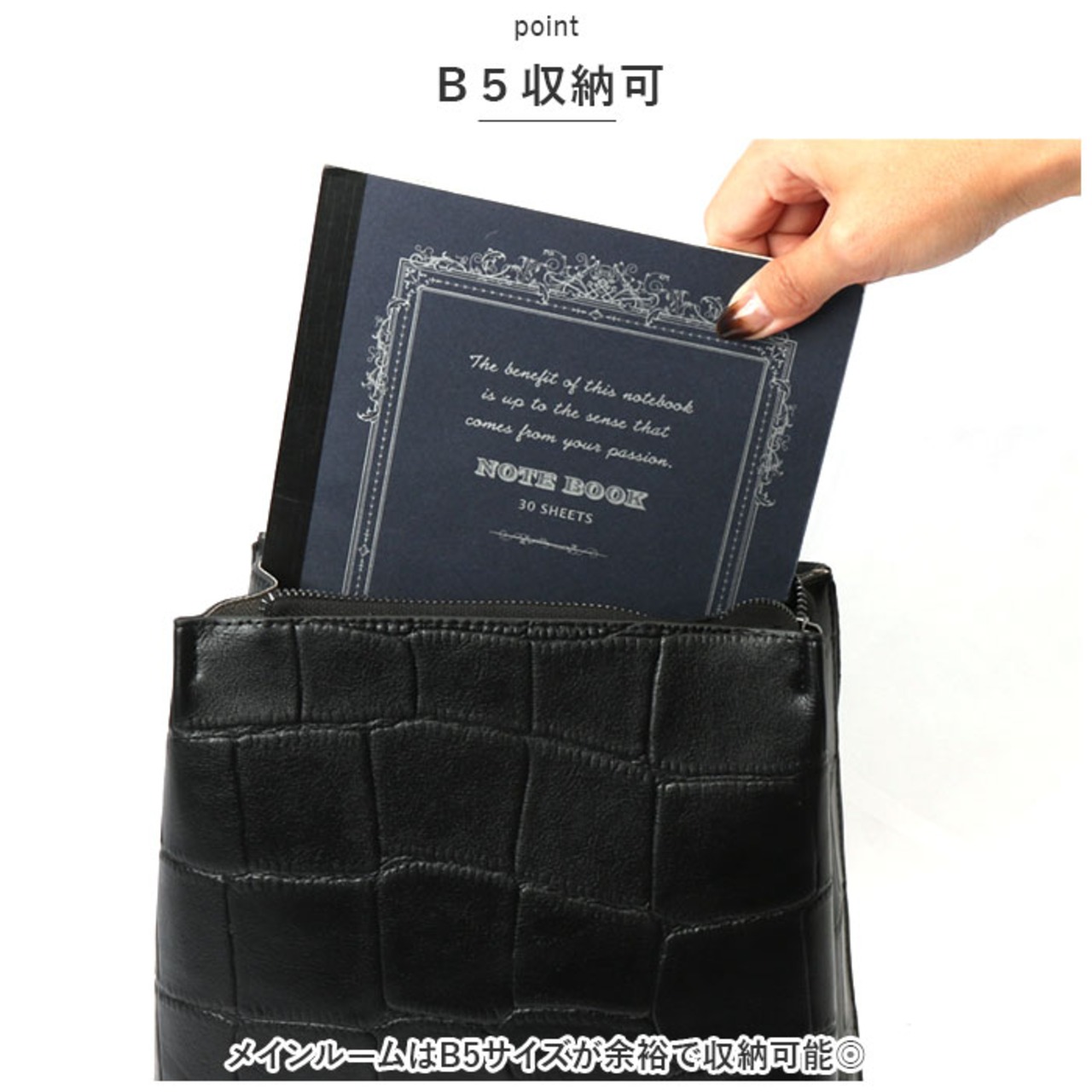 ・メインルームはB5サイズが余裕で収納でき、サイドのスナップボタンでマチ幅調整可能。多ポケットで小物の整理もしやすく、マチがしっかりあるので見た目以上の収納力。