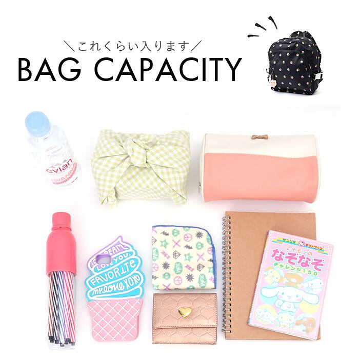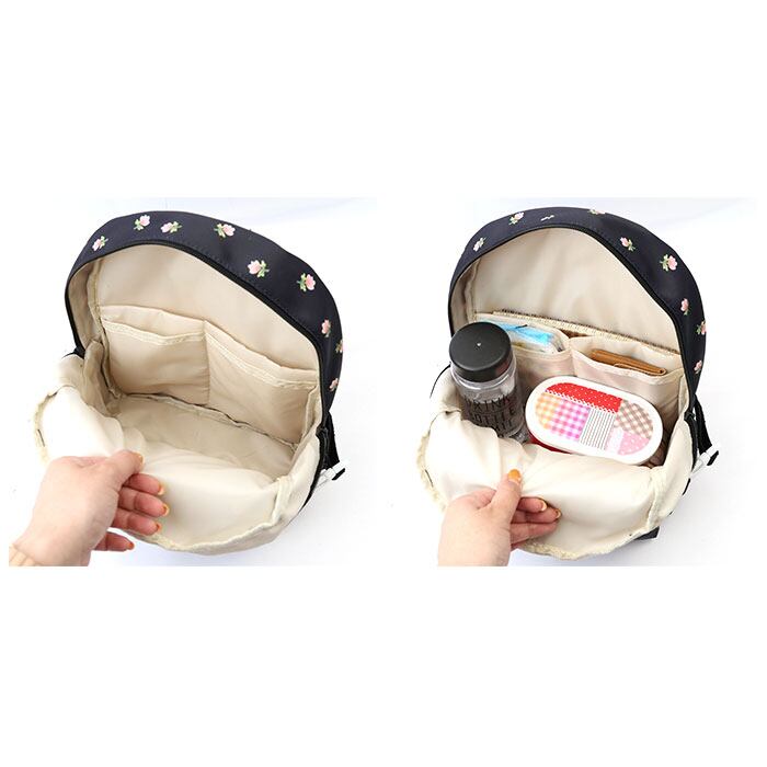 ・メイン収納部はダブルファスナーで開閉しやすく、小さなお子様でも使いやすい設計。お弁当箱やお菓子など、必要なものがしっかり入るマチ幅。