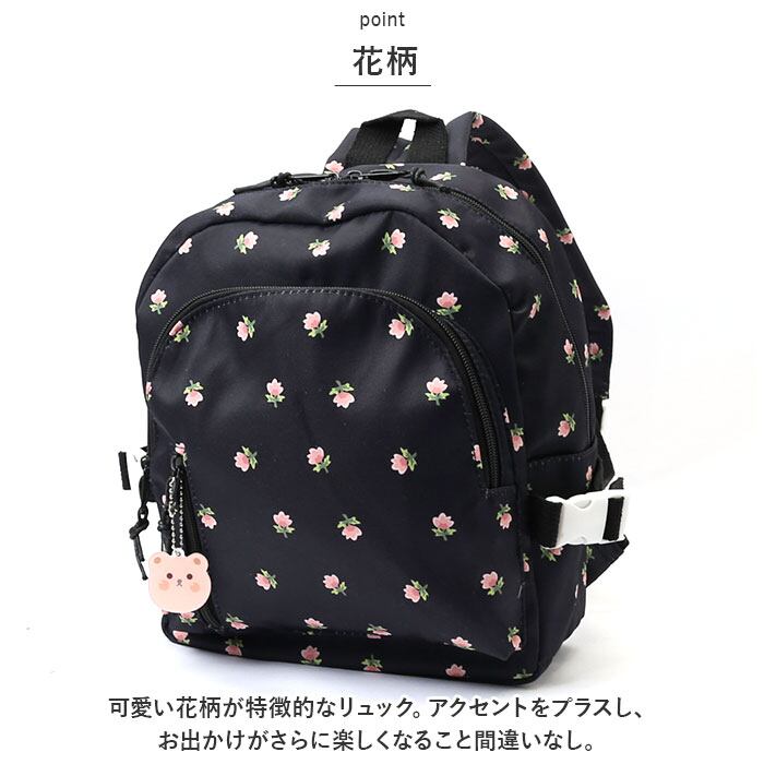 ・可愛い花柄が特徴的なリュック。アクセントをプラスし、お出かけがさらに楽しくなること間違いなし。