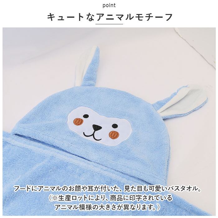 ・フードにアニマルのお顔や耳が付いた、見た目も可愛いバスタオル。(※生産ロットにより、商品に印字されているアニマル模様の大きさが異なります。)