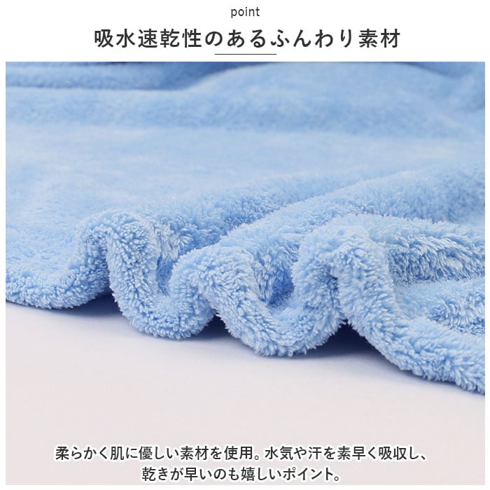 ・柔らかく肌に優しい素材を使用。水気や汗を素早く吸収し、乾きが早いのも嬉しいポイント。