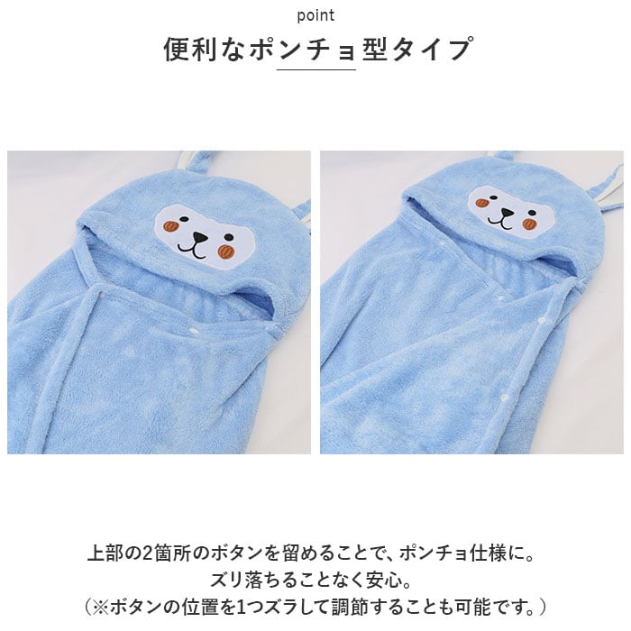 ・上部の2箇所のボタンを留めることで、ポンチョ仕様に。ズリ落ちることなく安心。(※ボタンの位置を1つズラして調節することも可能です。)