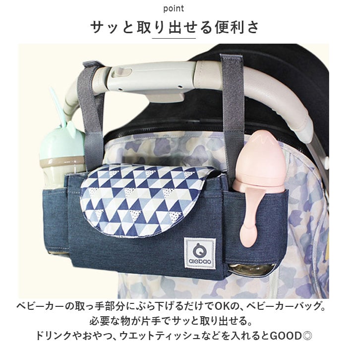 ・ベビーカーの取っ手部分にぶら下げるだけでOKの、ベビーカーバッグ。必要な物が片手でサッと取り出せる。ドリンクやおやつ、ウエットティッシュなどを入れるとGOOD◎