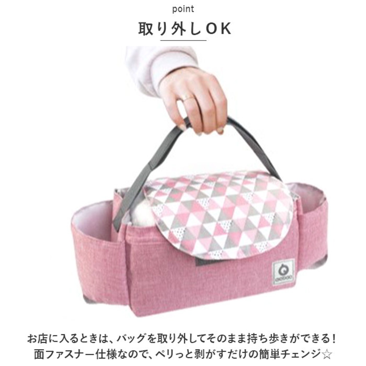 ・お店に入るときは、バッグを取り外してそのまま持ち歩きができる!面ファスナー仕様なので、ペリっと剥がすだけの簡単チェンジ☆