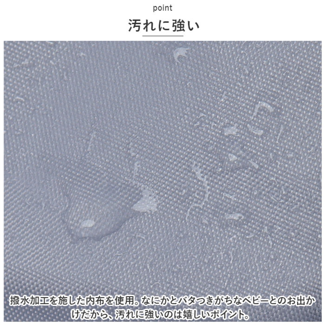 ・撥水加工を施した内布を使用。なにかとバタつきがちなベビーとのお出かけだから、汚れに強いのは嬉しいポイント。
