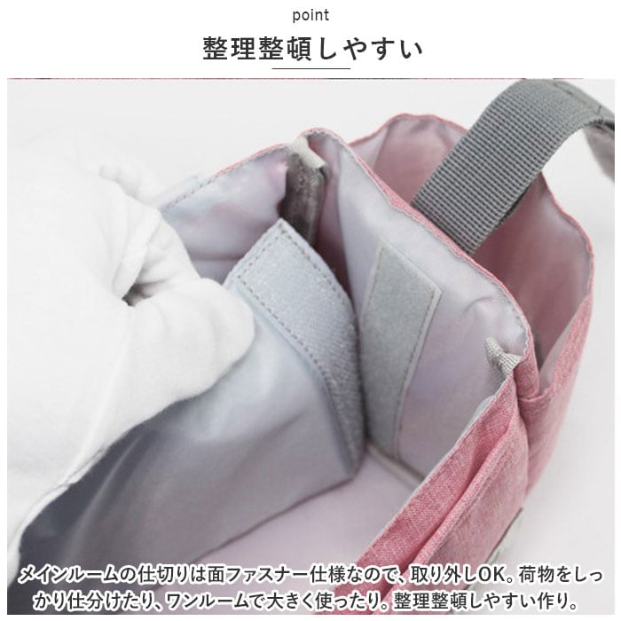 ・メインルームの仕切りは面ファスナー仕様なので、取り外しOK。荷物をしっかり仕分けたり、ワンルームで大きく使ったり。整理整頓しやすい作り。