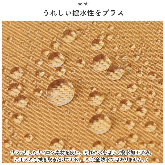 ・サラッとしたナイロン素材を使い、汚れや水をはじく撥水加工済み。お手入れも拭き取るだけでOK。(※完全防水ではありません。)