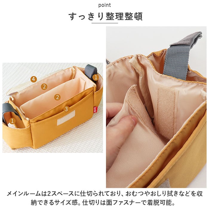 ・メインルームは2スペースに仕切られており、おむつやおしり拭きなどを収納できるサイズ感。仕切りは面ファスナーで着脱可能。