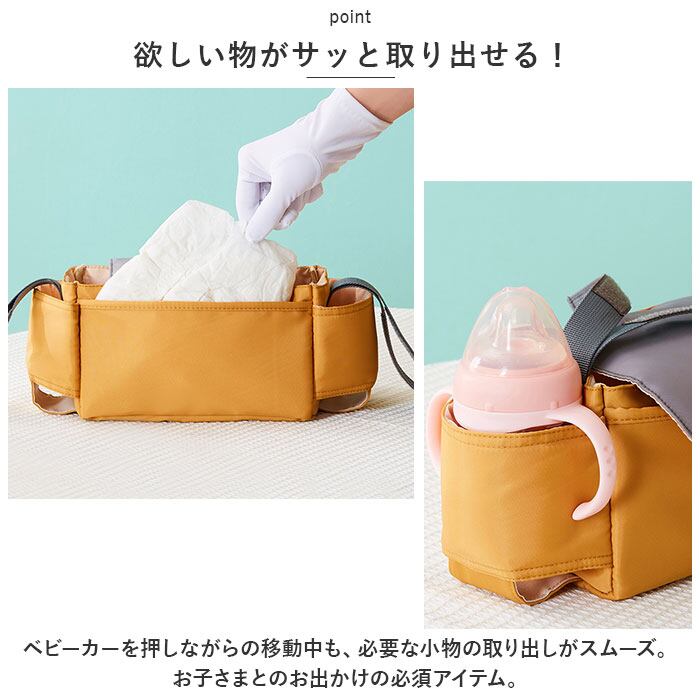 ・ベビーカーを押しながらの移動中も、必要な小物の取り出しがスムーズ。お子さまとのお出かけの必須アイテム。