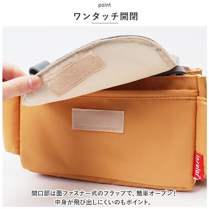 ・開口部は面ファスナー式のフラップで、簡単オープン!中身が飛び出しにくいのもポイント。