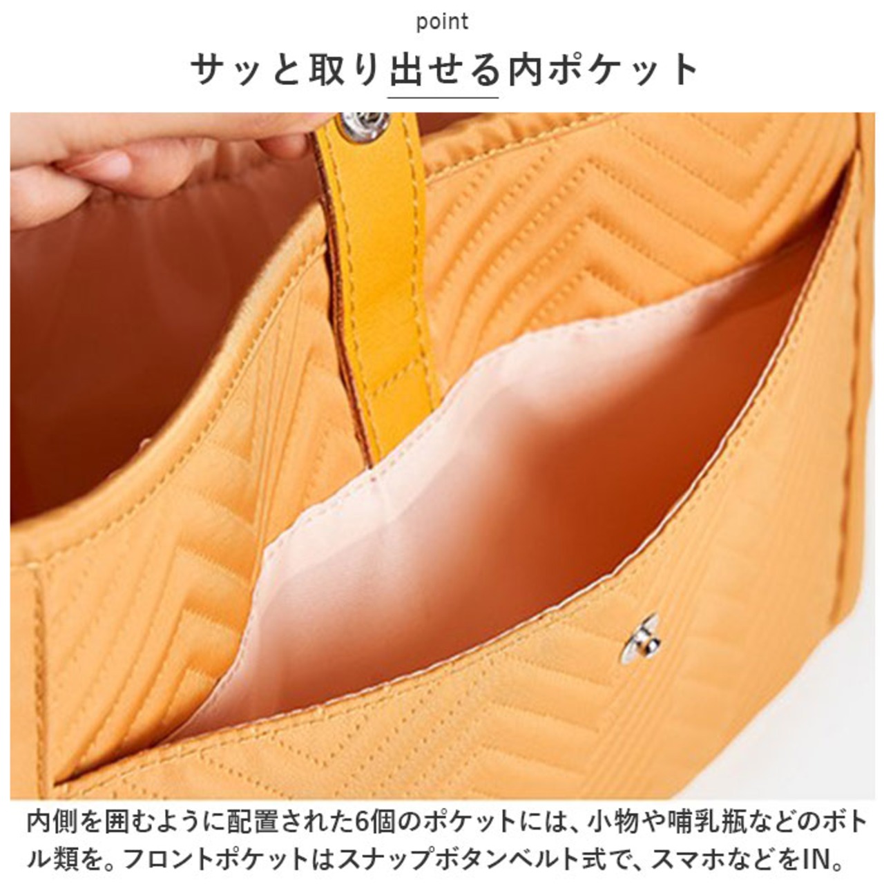 ・内側を囲むように配置された6個のポケットには、小物や哺乳瓶などのボトル類を。フロントポケットはスナップボタンベルト式で、スマホなどをIN。