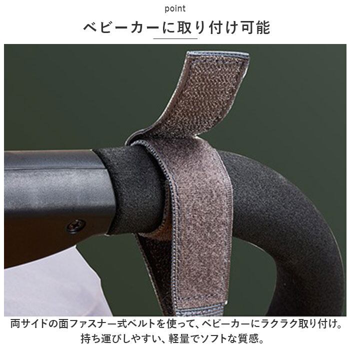 ・両サイドの面ファスナー式ベルトを使って、ベビーカーにラクラク取り付け。持ち運びしやすい、軽量でソフトな質感。