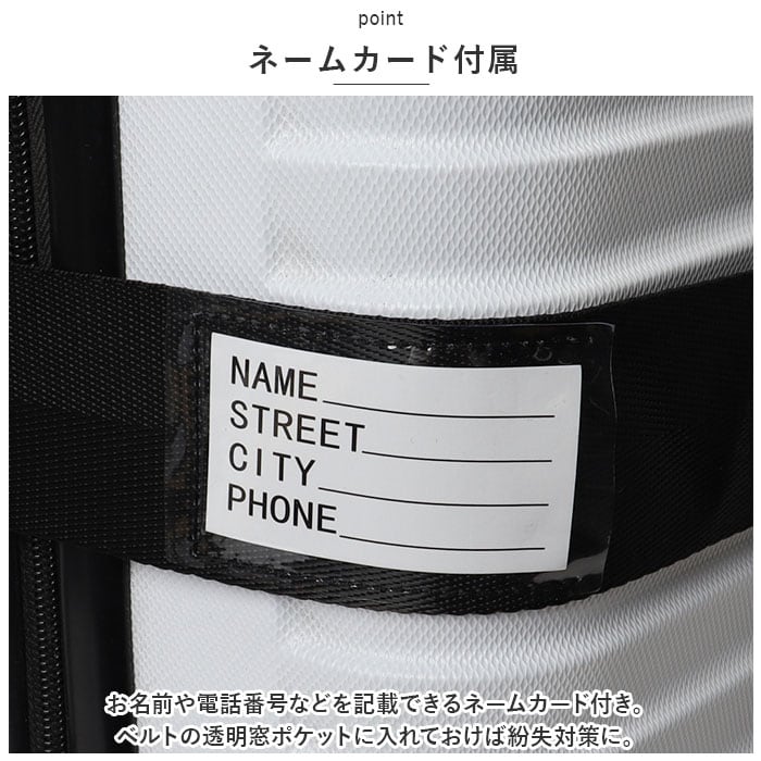 ・お名前や電話番号などを記載できるネームカード付き。ベルトの透明窓ポケットに入れておけば紛失対策に。