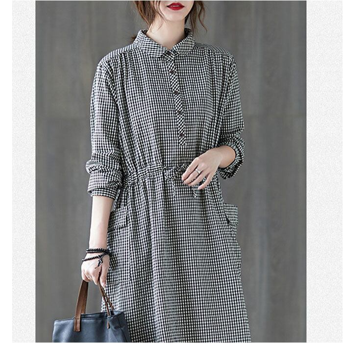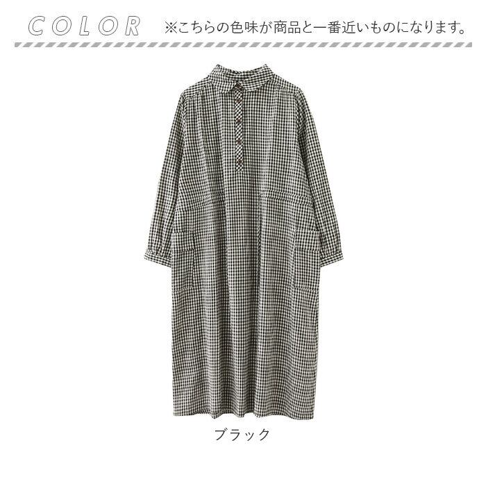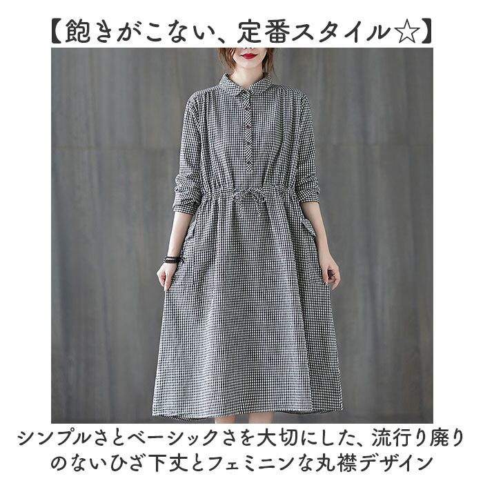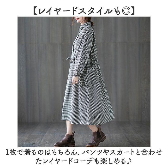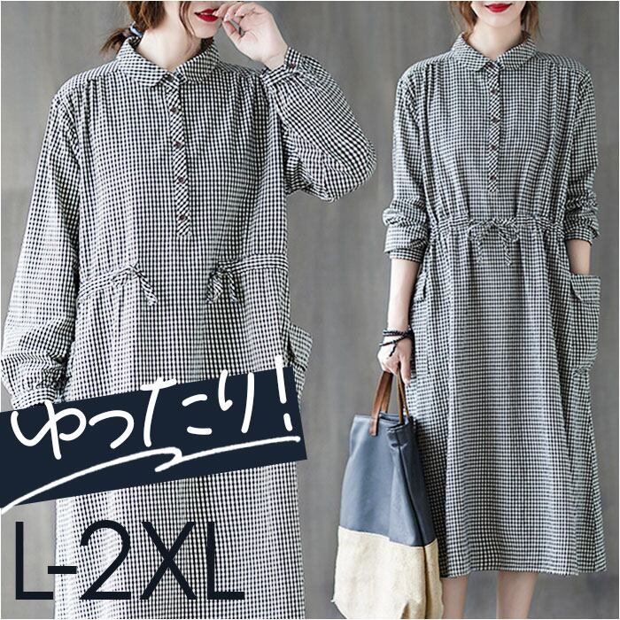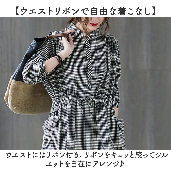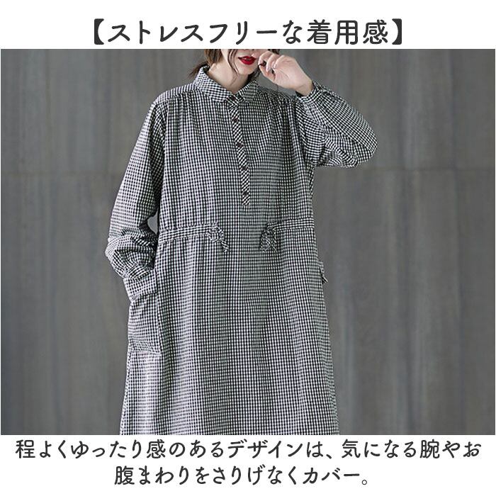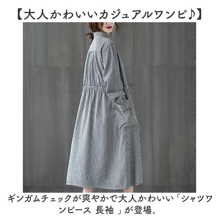 シャツワンピース ギンガムチェック 長袖 ロング レディース