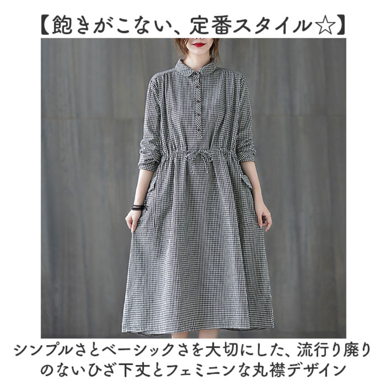 ・シンプルさとベーシックさを大切にした、流行り廃りのないひざ下丈とフェミニンな丸襟デザイン