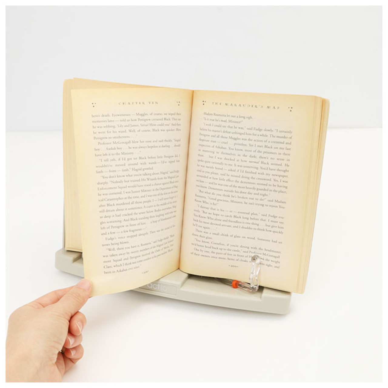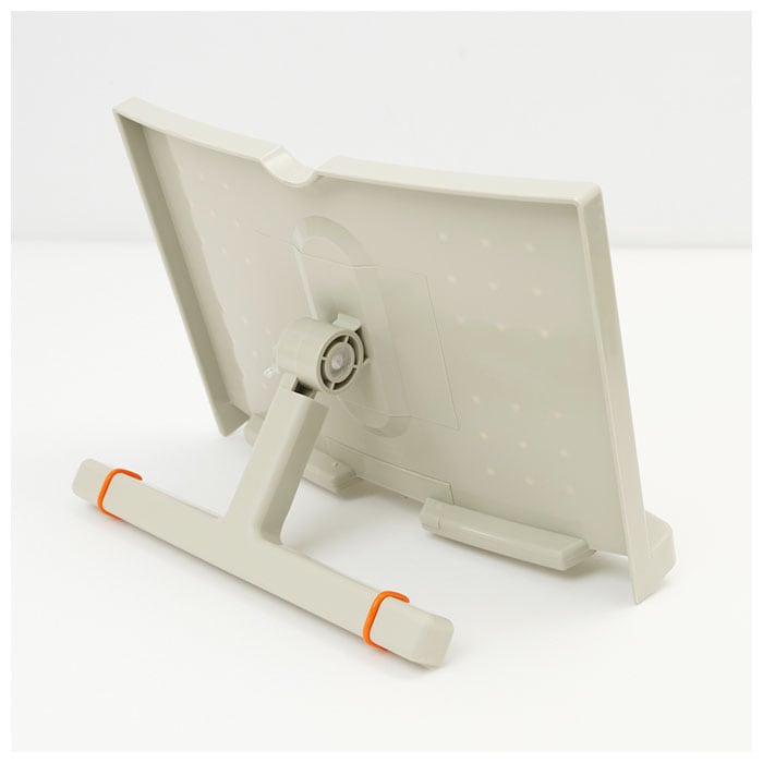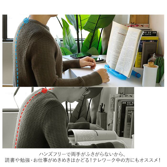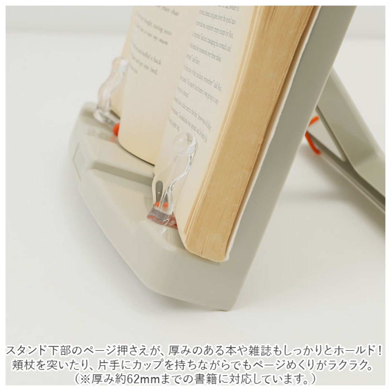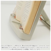 ・スタンド下部のページ押さえが、厚みのある本や雑誌もしっかりとホールド!頬杖を突いたり、片手にカップを持ちながらでもページめくりがラクラク。(※厚み約62mmまでの書籍に対応しています。)