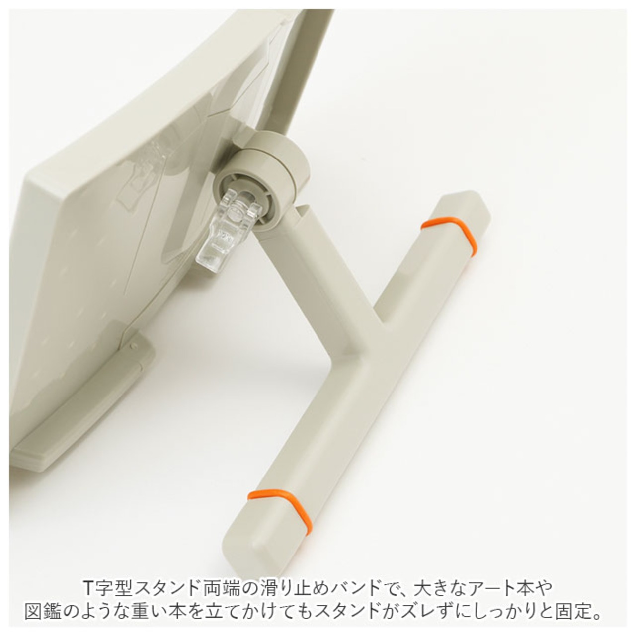 ・T字型スタンド両端の滑り止めバンドで、大きなアート本や図鑑のような重い本を立てかけてもスタンドがズレずにしっかりと固定。