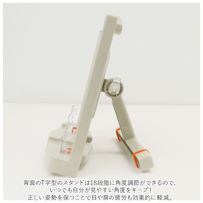 ・背面のT字型のスタンドは18段階に角度調節ができるので、いつでも自分が見やすい角度をキープ!正しい姿勢を保つことで目や肩の疲労も効果的に軽減。