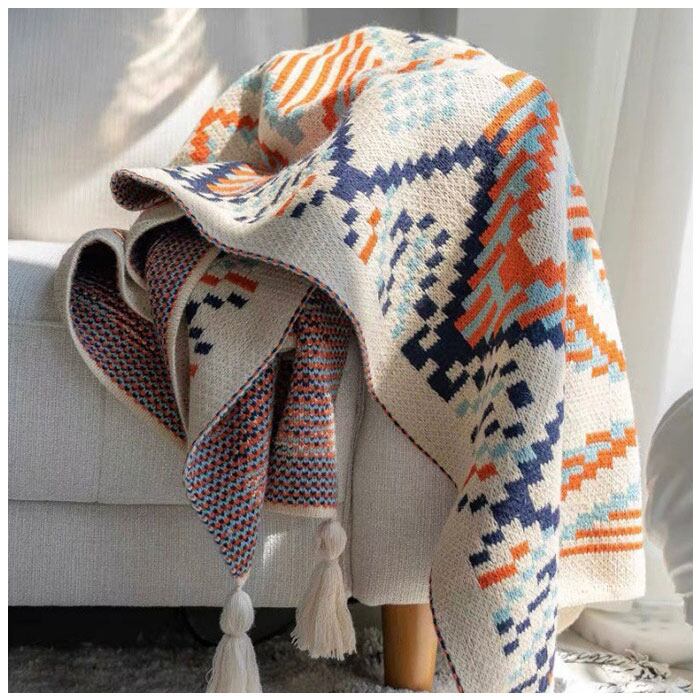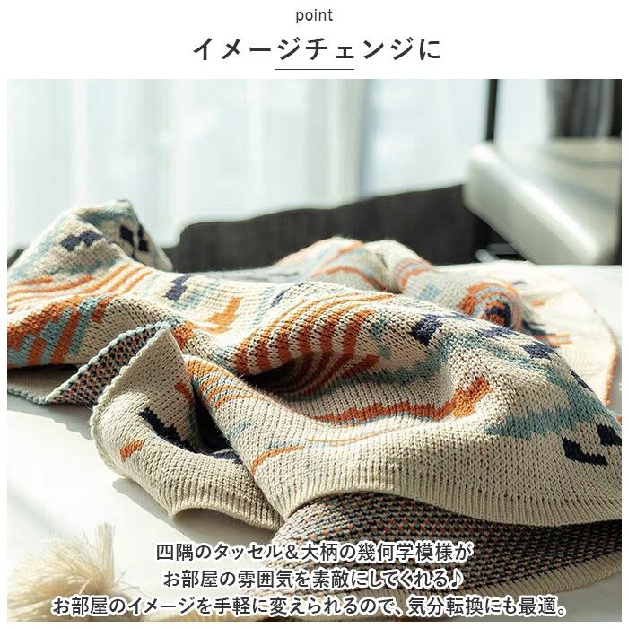 ・四隅のタッセル&大柄の幾何学模様がお部屋の雰囲気を素敵にしてくれる♪お部屋のイメージを手軽に変えられるので、気分転換にも最適。