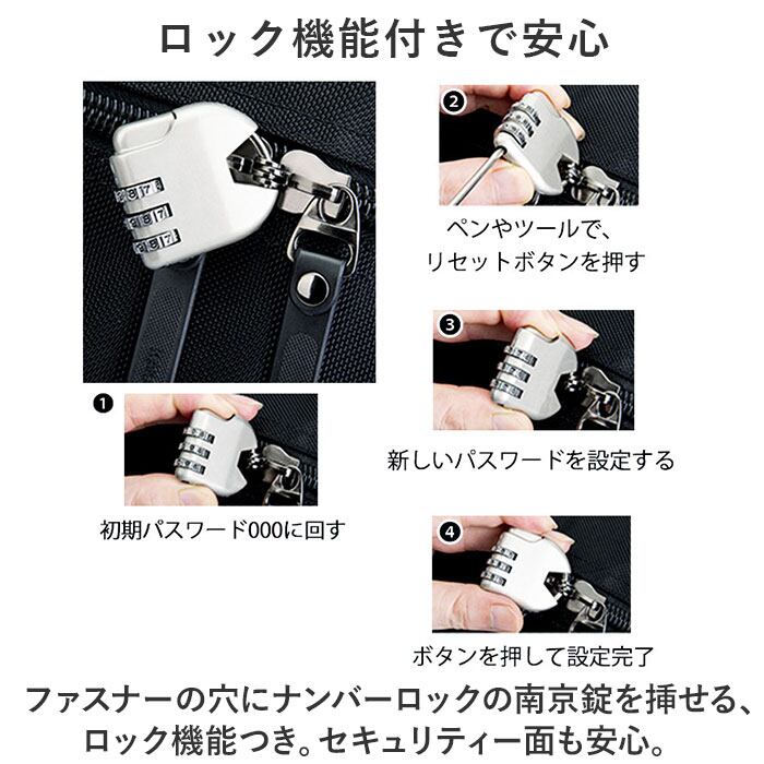 ・ファスナーの穴にナンバーロックの南京錠を挿せる、ロック機能つき。セキュリティー面も安心。