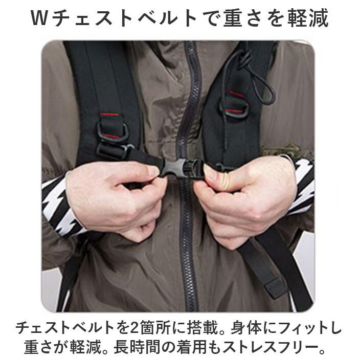 ・チェストベルトを2箇所に搭載。身体にフィットし重さが軽減。長時間の着用もストレスフリー。