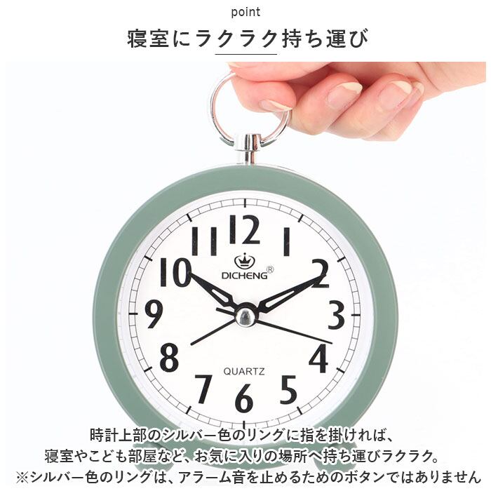 ・時計上部のシルバー色のリングに指を掛ければ、寝室やこども部屋など、お気に入りの場所へ持ち運びラクラク。(※シルバー色のリングは、アラーム音を止めるためのボタンではありません。)