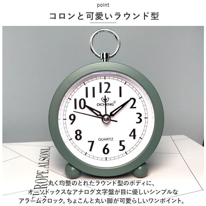 ・丸く均整のとれたラウンド型のボディに、オーソドックスなアナログ文字盤が目に優しいシンプルなアラームクロック。ちょこんと丸い脚が可愛らしいワンポイント。
