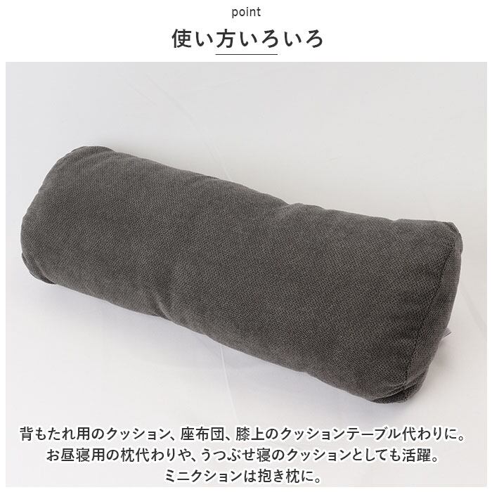 ・背もたれ用のクッション、座布団、膝上のクッションテーブル代わりに。お昼寝用の枕代わりや、うつぶせ寝のクッションとしても活躍。ミニクションは抱き枕に。