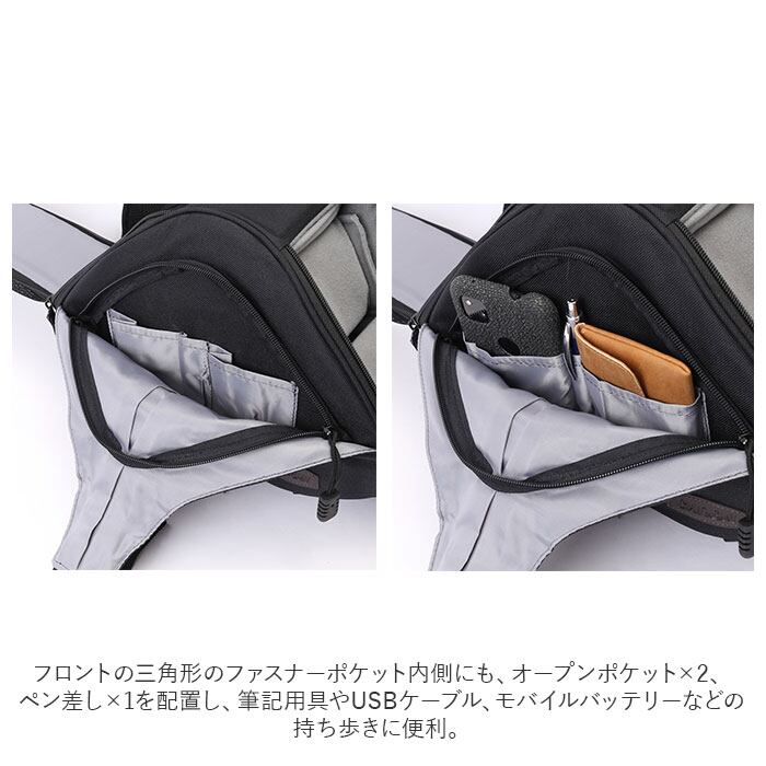 ・フロントの三角形のファスナーポケット内側にも、オープンポケット×2、ペン差し×1を配置し、筆記用具やUSBケーブル、モバイルバッテリーなどの持ち歩きに便利。