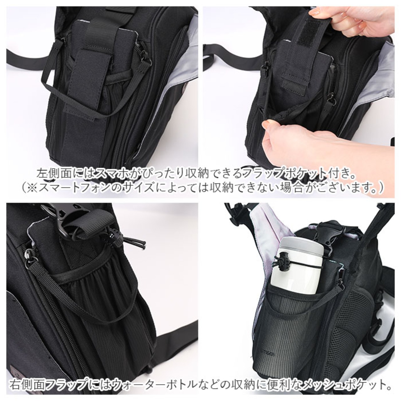・バッグ外側にも小物の整理に役立つポケットを多数配置。右側面フラップにはウォーターボトルなどの収納に便利なメッシュポケット。左側面にはスマホがぴったり収納できるフラップポケット付き。(※スマートフォンのサイズによっては収納できない場合がございます。ウォーターボトルは350ml程度のボトルに適したサイズです。)