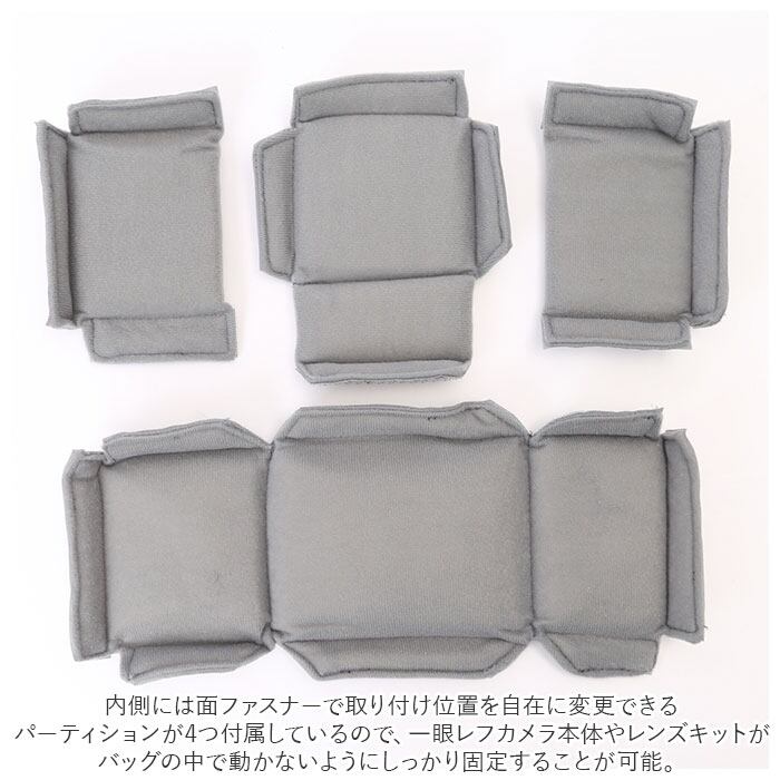 ・内側には面ファスナーで取り付け位置を自在に変更できるパーティションが4つ付属しているので、一眼レフカメラ本体やレンズキットがバッグの中で動かないようにしっかり固定することが可能。