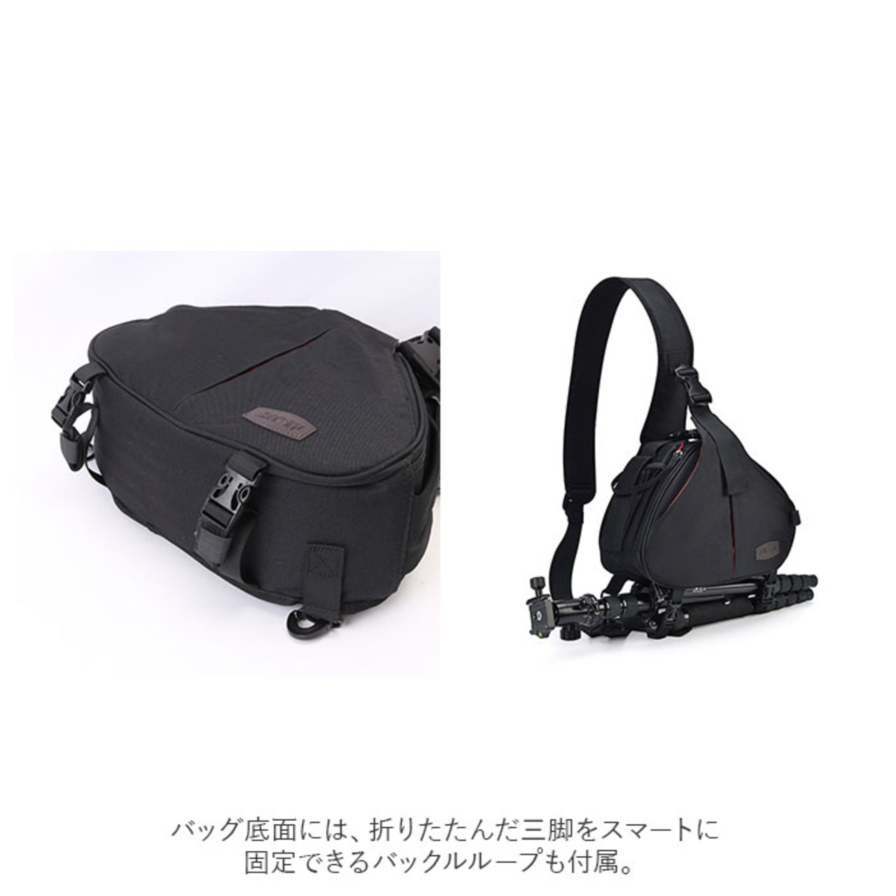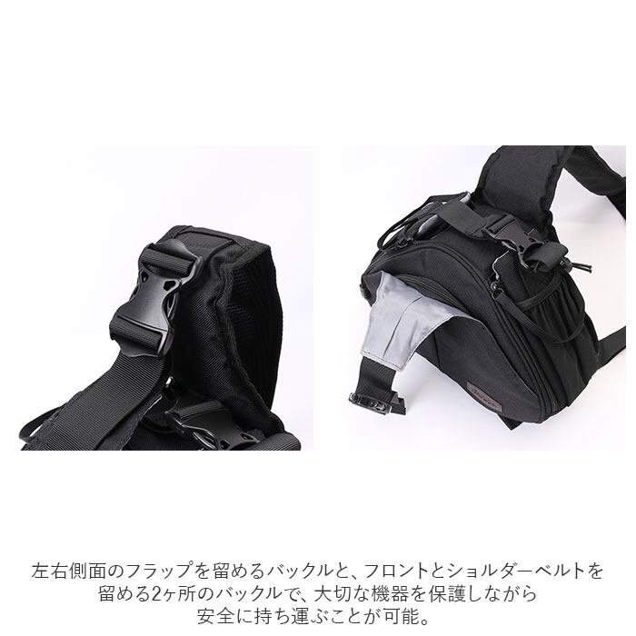 ・左右側面のフラップを留めるバックルと、フロントとショルダーベルトを留める2ヶ所のバックルで、大切な機器を保護しながら安全に持ち運ぶことが可能。バッグ底面には、折りたたんだ三脚をスマートに固定できるバックルループも付属。