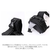 ・ボディバッグのように身軽に持てるワンショルダースタイルに、ウエストのループベルトを固定することで、さらに安定感がUP!ショルダーベルト裏側やバッグ背面には、長時間背負うときでも快適なメッシュ加工ずみ。