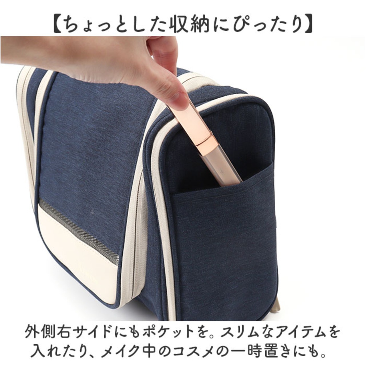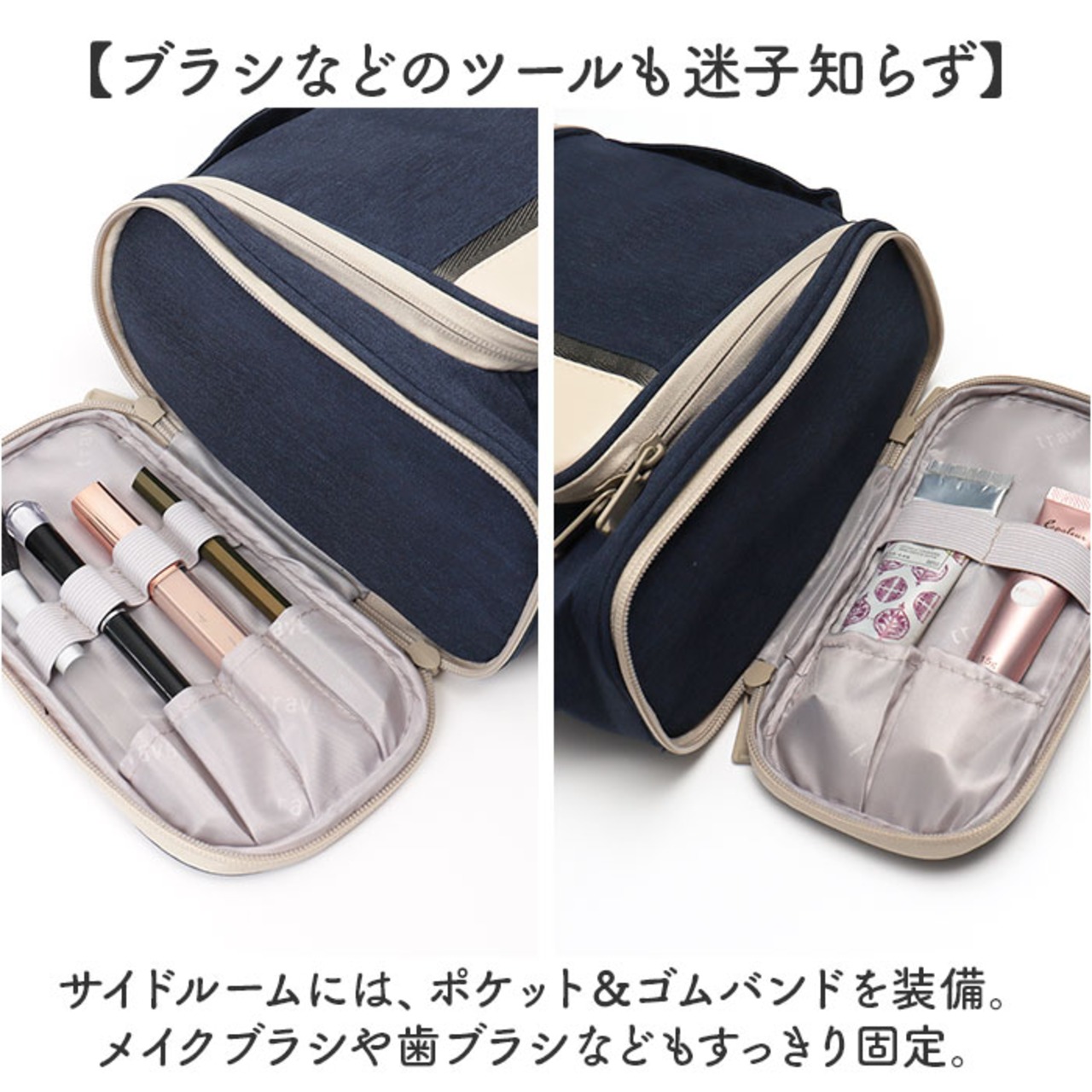 ・サイドルームには、ポケット&ゴムバンドを装備。メイクブラシや歯ブラシなどもすっきり固定。