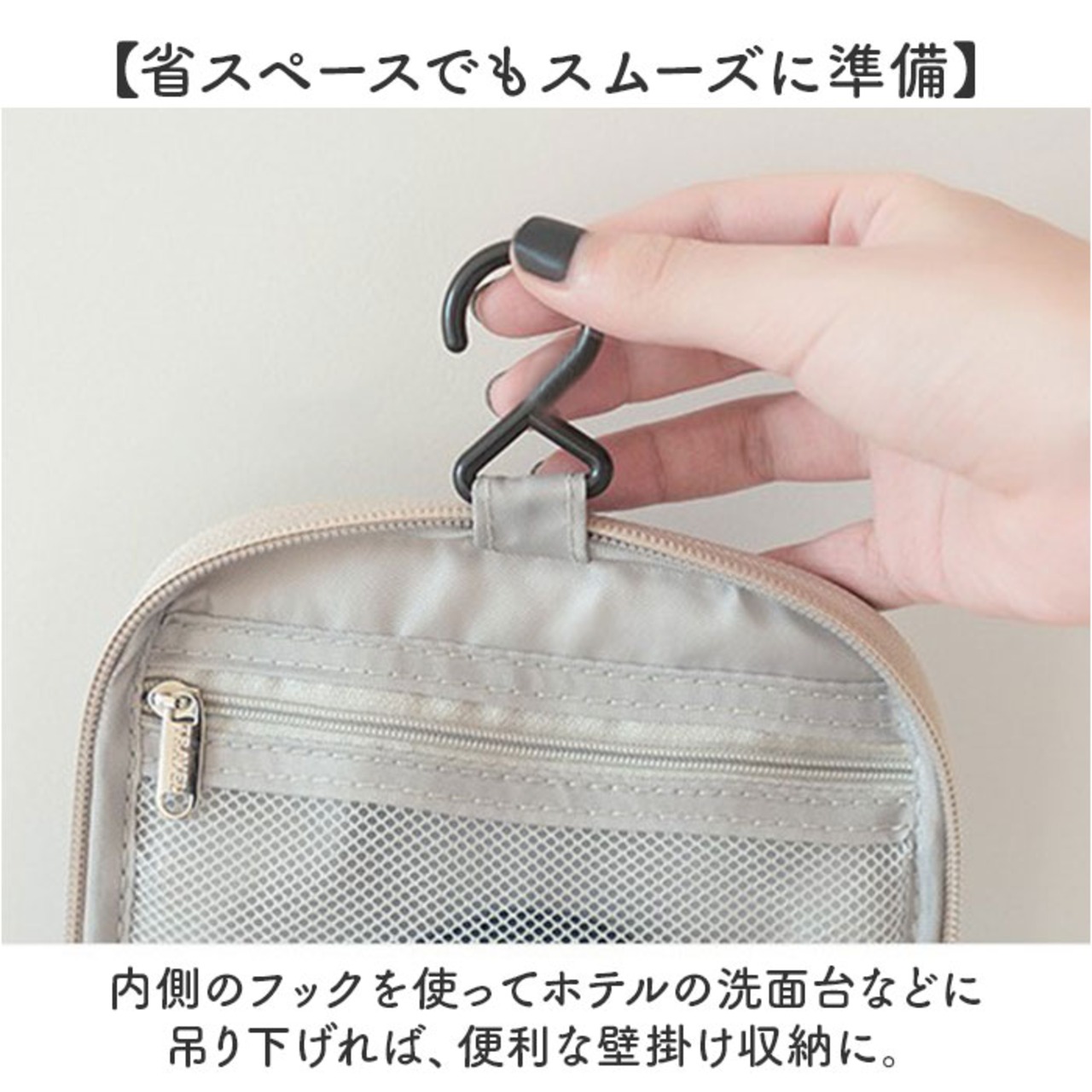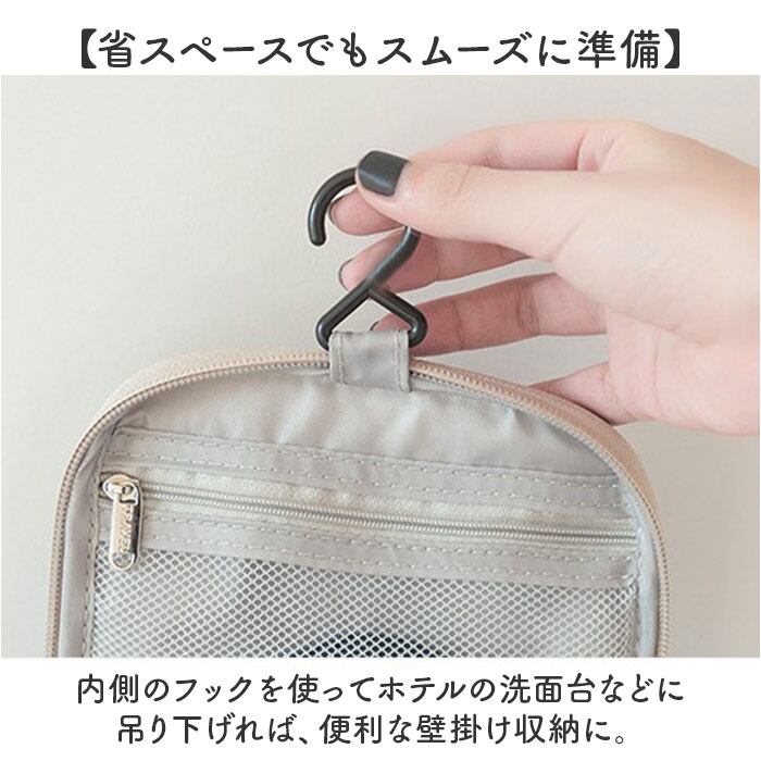・内側のフックを使ってホテルの洗面台などに吊り下げれば、便利な壁掛け収納に。