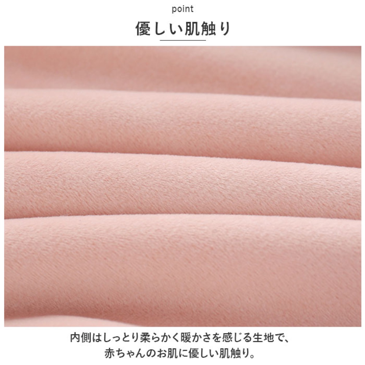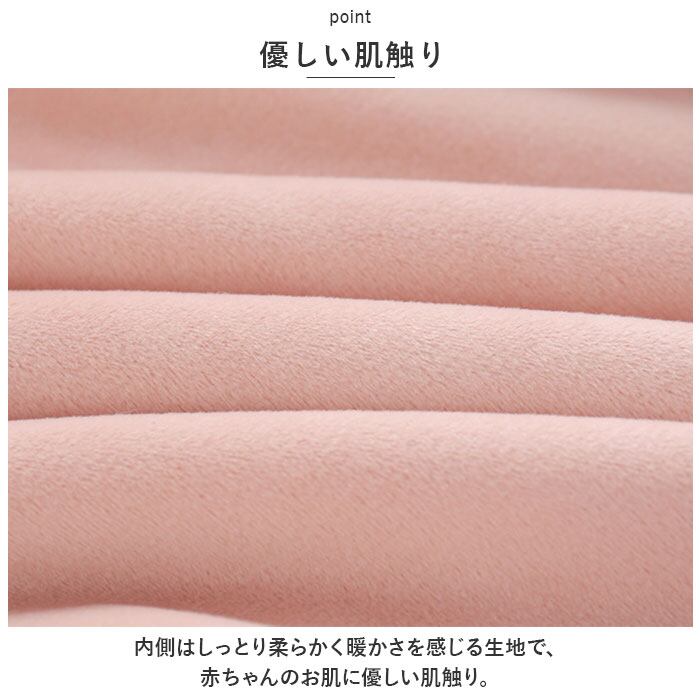 ・内側はしっとり柔らかく暖かさを感じる生地で、赤ちゃんのお肌に優しい肌触り。