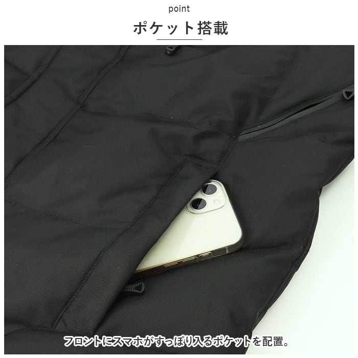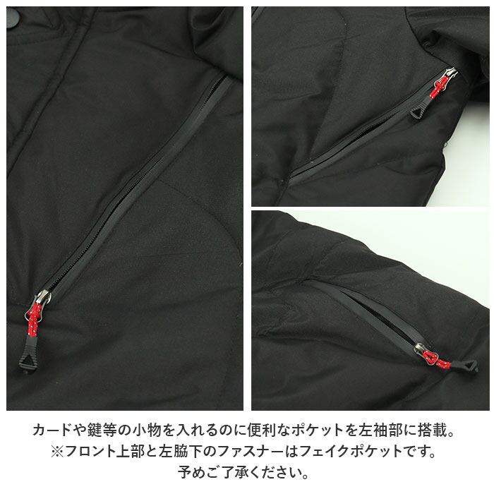 ・カードや鍵等の小物を入れるのに便利なポケットを左袖部に搭載。フロントにもスマホがすっぽり入るポケットを配置。(フロント上部と左脇下のファスナーはフェイクポケットです。予めご了承ください。)