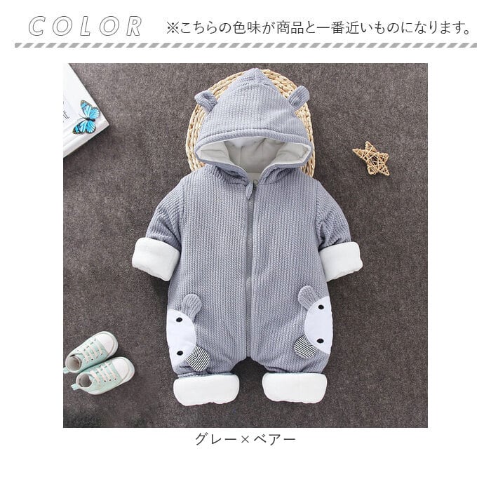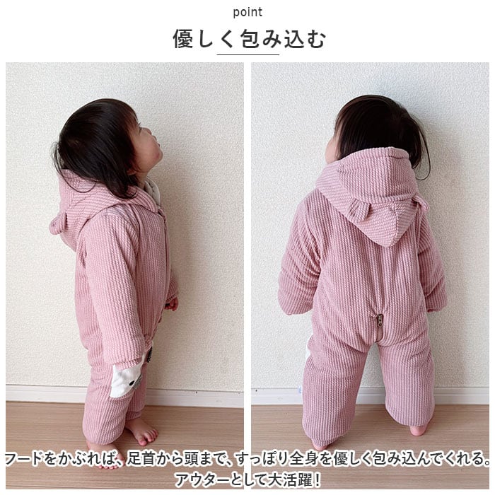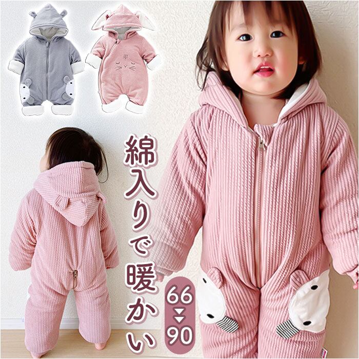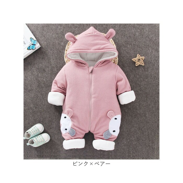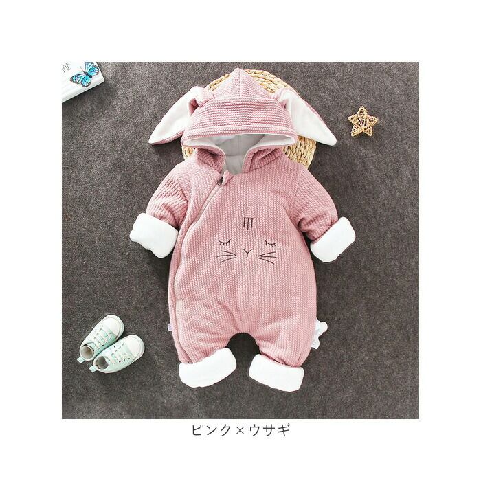 ベビー カバーオール 通販 ロンパース ジャンプスーツ 長袖 ベビー服 子供服 つなぎ 綿入り あったか 赤ちゃん 女の子 男の子 アウター 防寒 寒さ対策 耳付き フード付き ジップアップ リブ アニマル かわいい 可愛い オシャレ おしゃれ