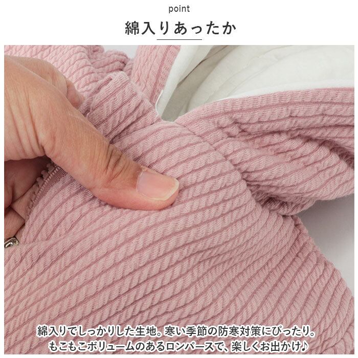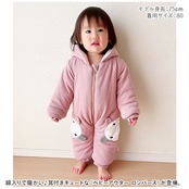 ・綿入りでしっかりした生地。寒い季節の防寒対策にぴったり。もこもこボリュームのあるロンパースで、楽しくお出かけ♪