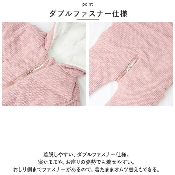 ・着脱しやすい、ダブルファスナー仕様。寝たままや、お座りの姿勢でも着せやすい。おしり側までファスナーがあるので、着たままオムツ替えもできる。