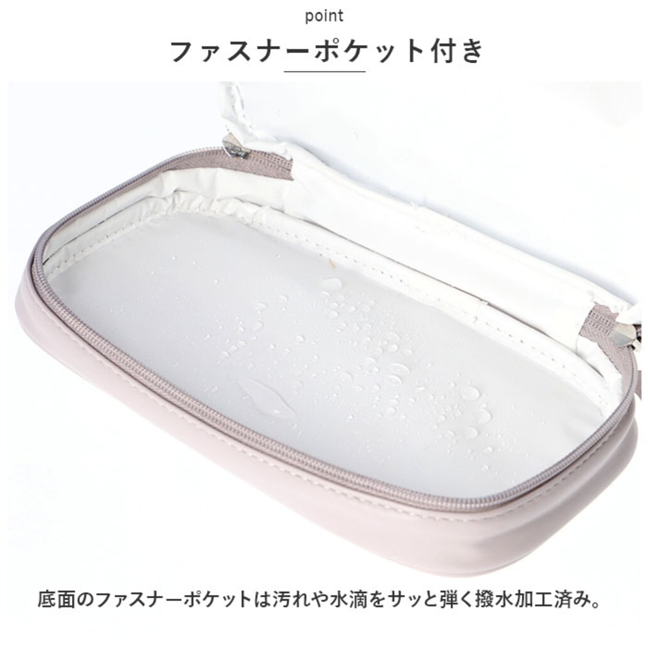・底面のファスナーポケットは汚れや水滴をサッと弾く撥水加工済み。