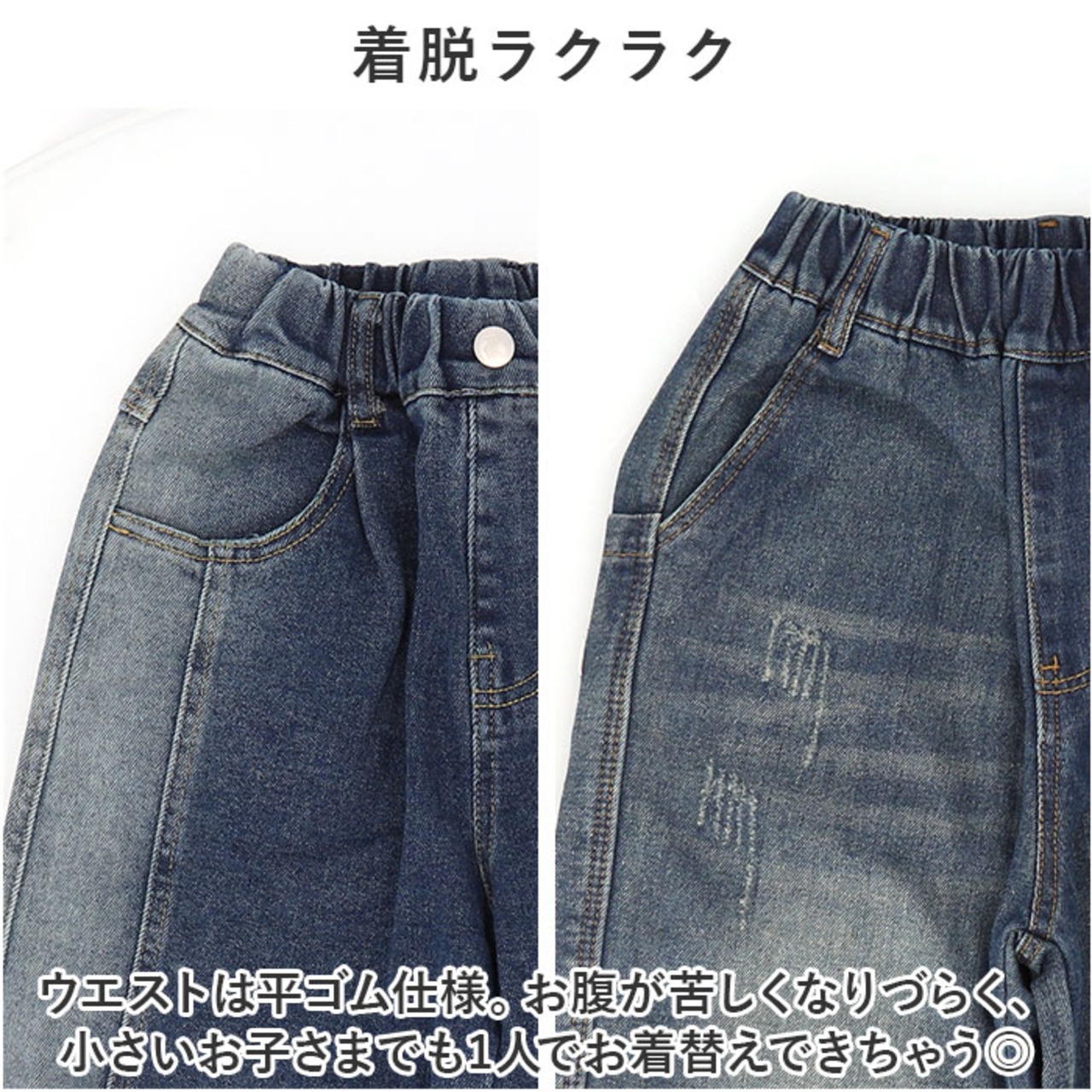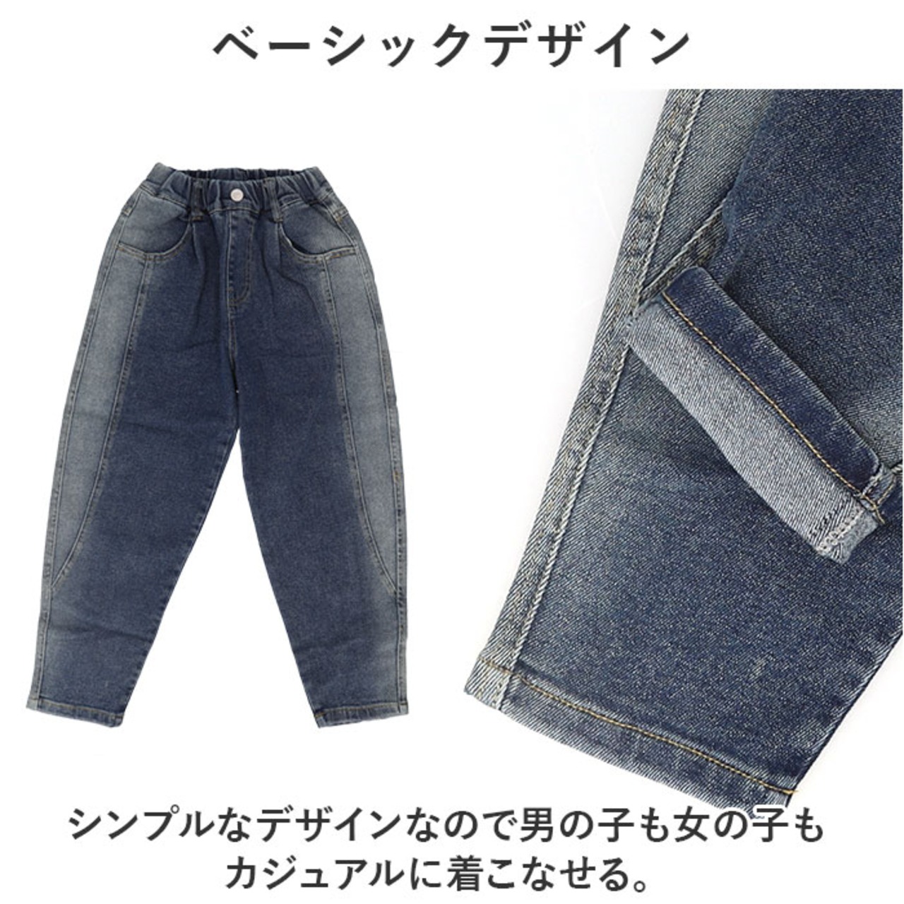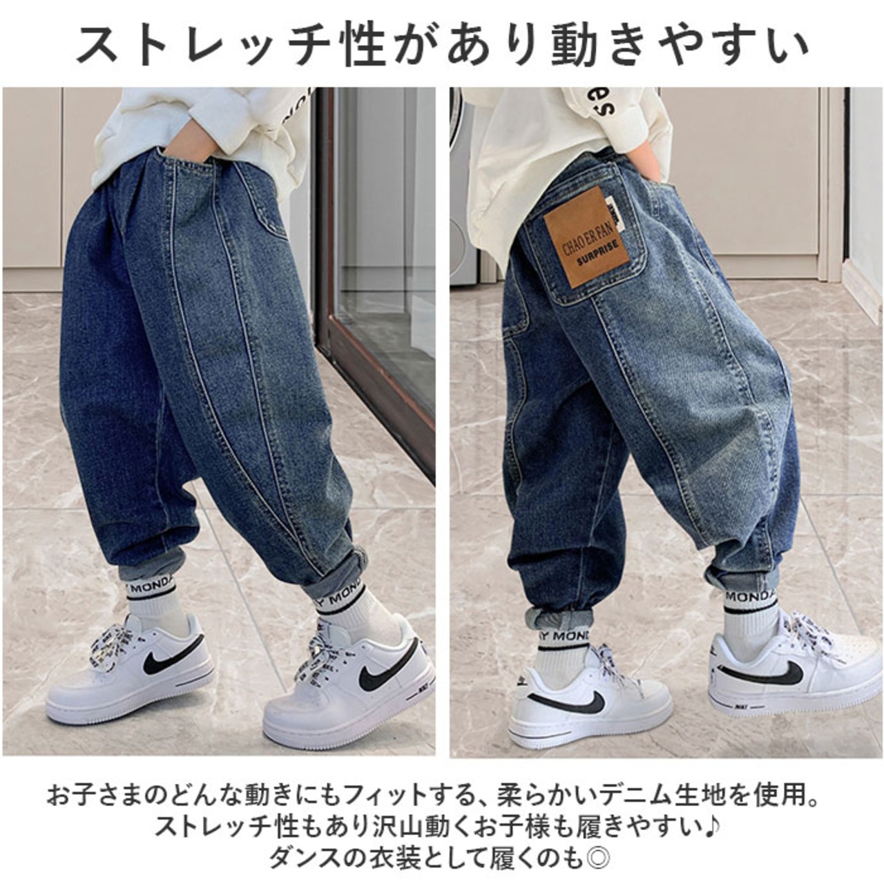 ・お子さまのどんな動きにもフィットする、柔らかいデニム生地を使用。ストレッチ性もあり沢山動くお子様も履きやすい♪ダンスの衣装として履くのも◎