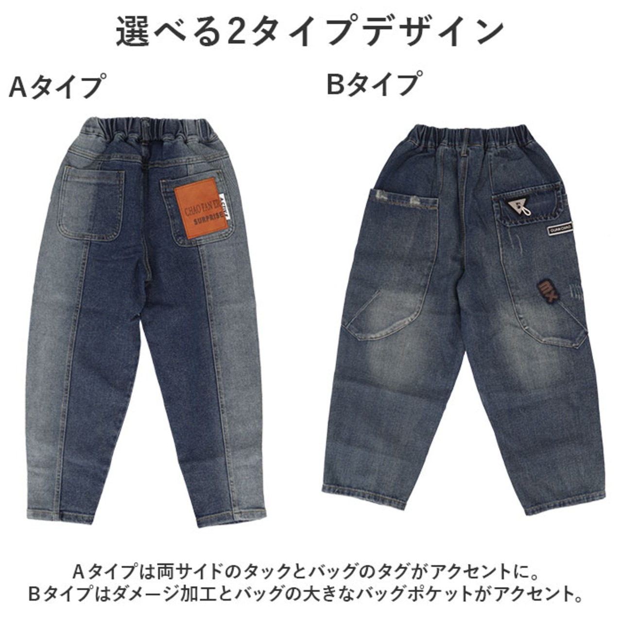 ・Aタイプは両サイドのタックとバッグのタグがアクセントに。Bタイプはダメージ加工とバッグの大きなバッグポケットがアクセント。